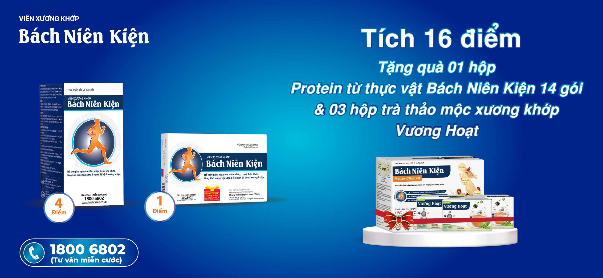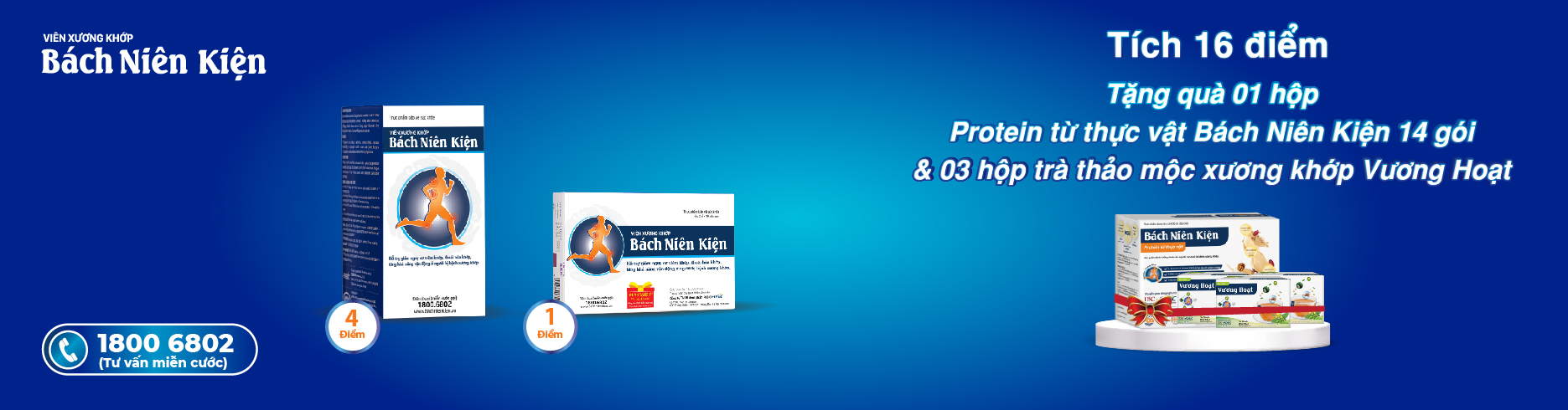 - Khi tích đủ 16 điểm, quý khách được tặng 1 hộp Protein từ thực vật Bách Niên Kiện 14 gói - dinh dưỡng cho người bị đau nhức xương khớp và 3 hộp Trà thảo mộc xương khớp Vương Hoạt, tổng trị giá 1.165.000đ.