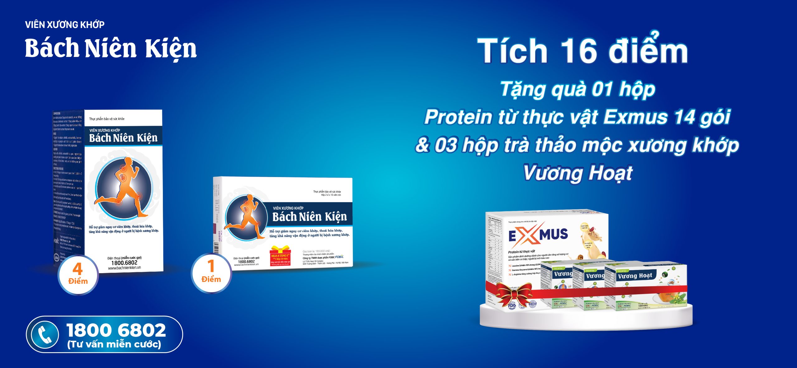 - Khi tích đủ 16 điểm, quý khách được tặng 1 hộp Protein từ thực vật Exmus 14 gói - dinh dưỡng chuyên biệt giúp tăng sức bền cơ bắp cho người bị đau nhức xương khớp và 3 hộp Trà thảo mộc xương khớp Vương Hoạt, tổng trị giá 1.265.000đ.