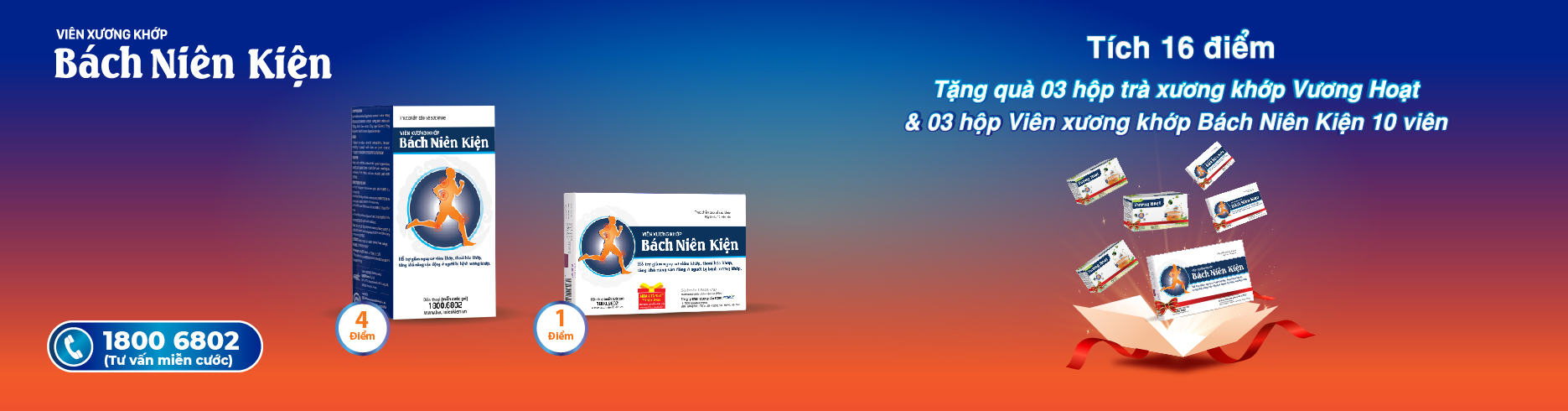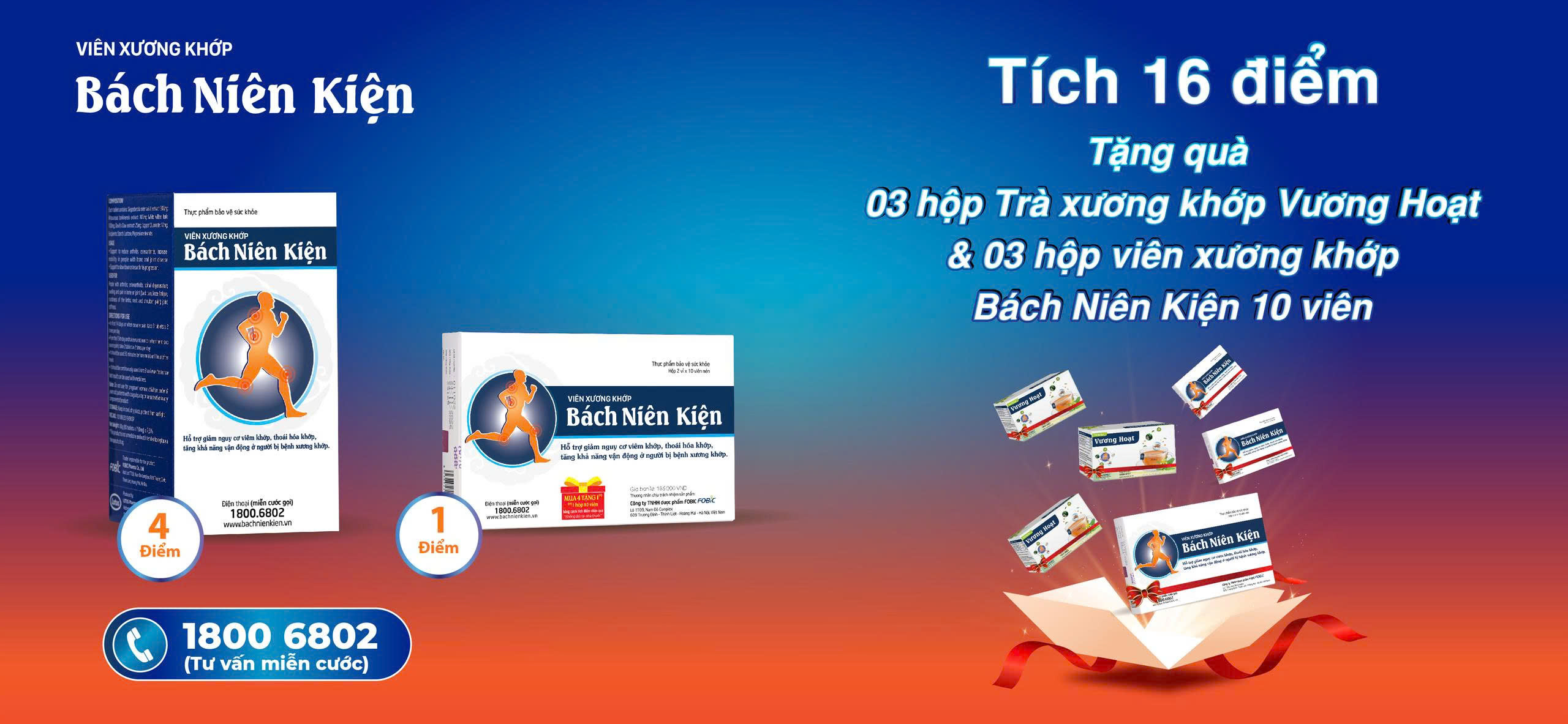 - Tích 8 điểm, quý khách được tặng 2 hộp Viên xương khớp Bách Niên Kiện 10 viên trị giá 200.000đ hoặc 2 hộp trà xương khớp Vương Hoạt trị giá 380.000đ.